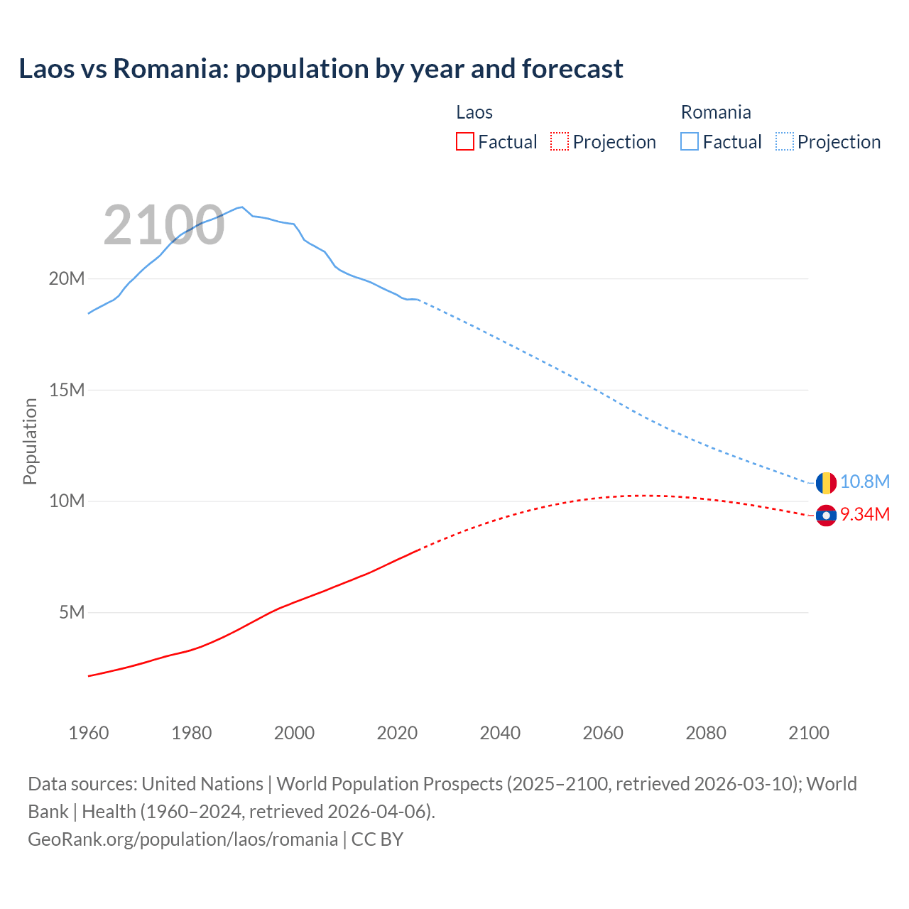 The latest officially reported population of Laos was 7,769,819 in 2024 vs 19,051,804 people in Romania in 2024. In 2026, based on the adjusted UN estimation, the current Laos' population is 8,004,838 people compared to 18,839,108 in Romania.