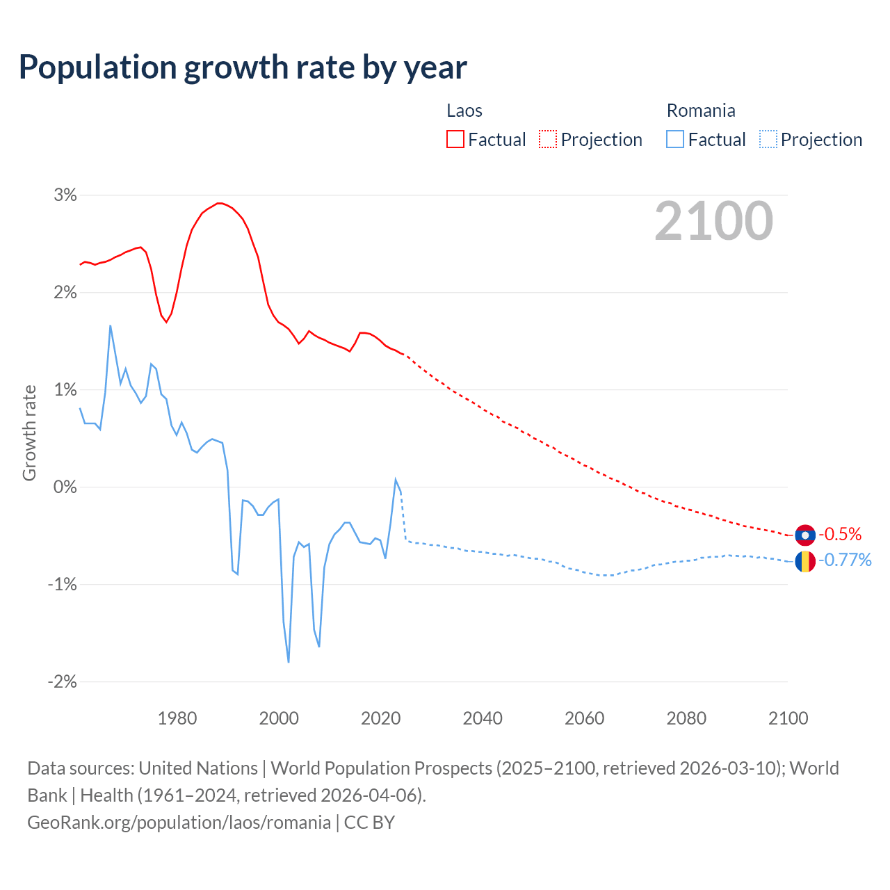 - For the last 10 years, Laos has had an average growth rate of +1.48% per year vs -0.43% in Romania.