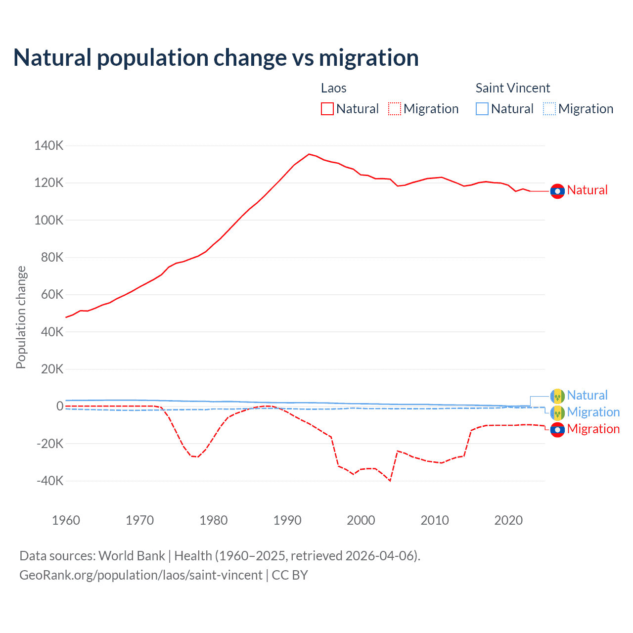 Over the last 10 years, 90.6% of the population change in Laos is from natural causes (a gain of 1,183,013 people) and 9.41% is from migration (a loss of 122,899 people). In Saint Vincent 21.2% is from natural causes (a gain of 2,525 people) and 78.8% is from migration (a loss of 9,393 people).