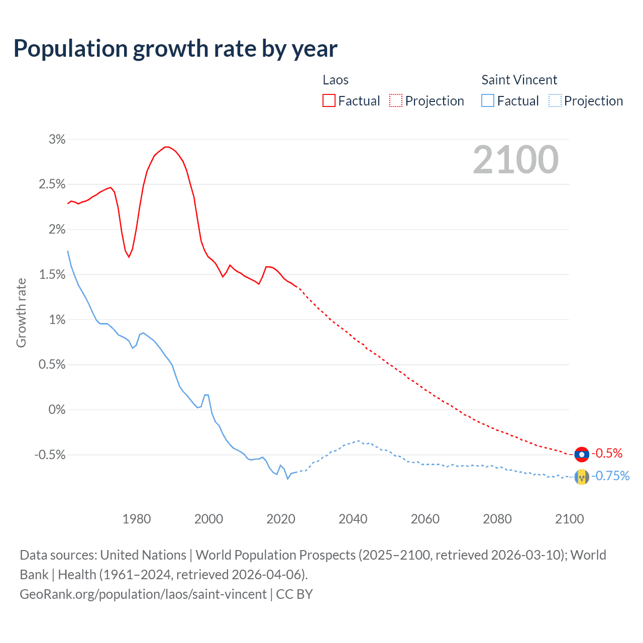 - For the last 10 years, Laos has had an average growth rate of +1.48% per year vs -0.65% in Saint Vincent.