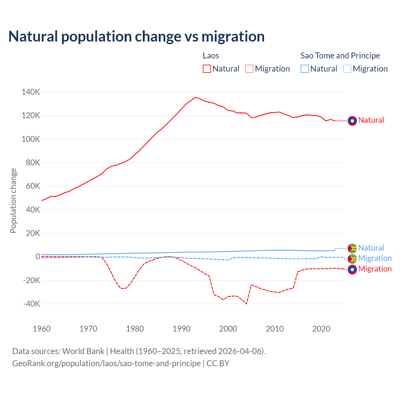 Over the last 10 years, 90.6% of the population change in Laos is from natural causes (a gain of 1,183,013 people) and 9.41% is from migration (a loss of 122,899 people). In Sao Tome and Principe 80.1% is from natural causes (a gain of 50,822 people) and 19.9% is from migration (a loss of 12,621 people).