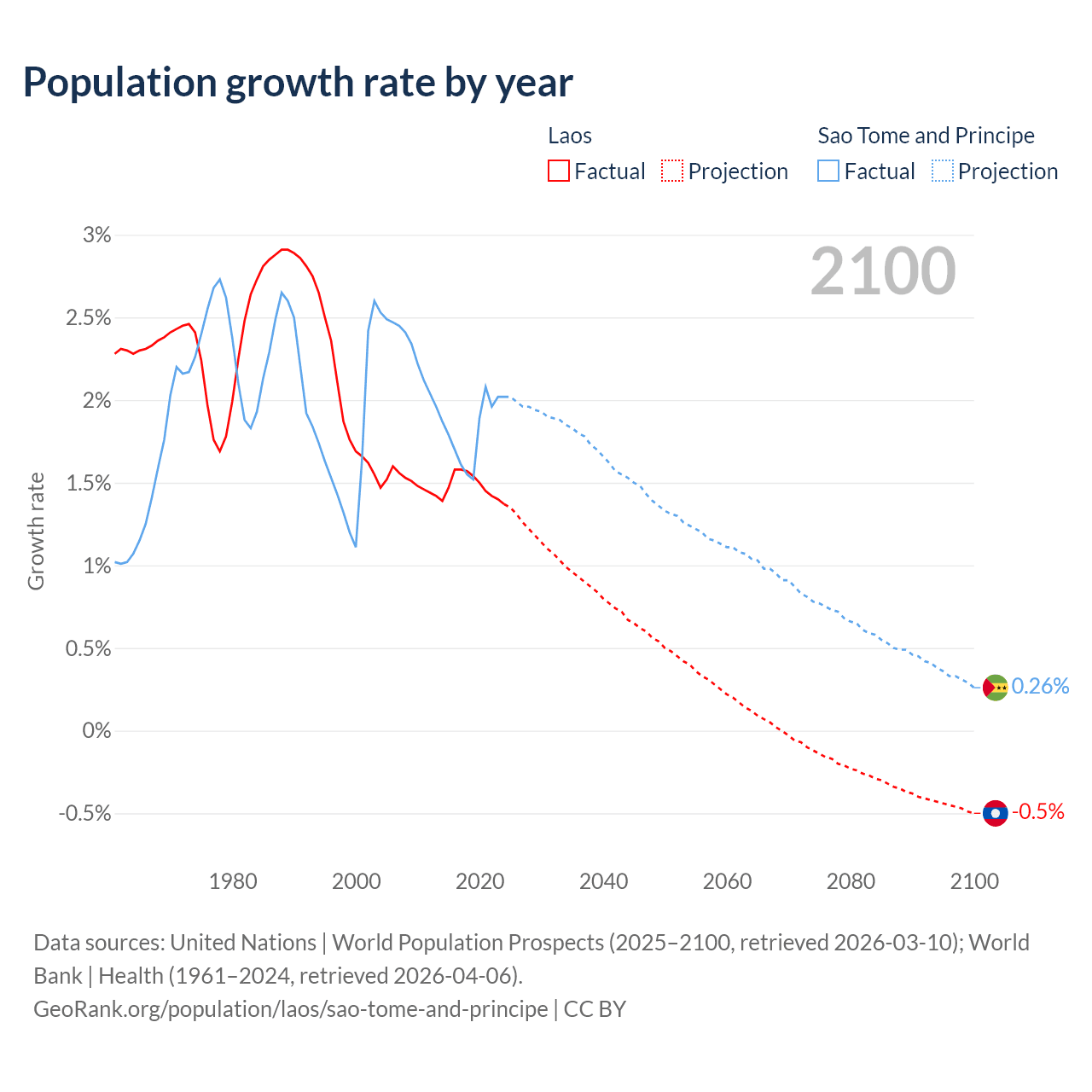 - For the last 10 years, Laos has had an average growth rate of +1.48% per year vs +1.82% in Sao Tome and Principe.