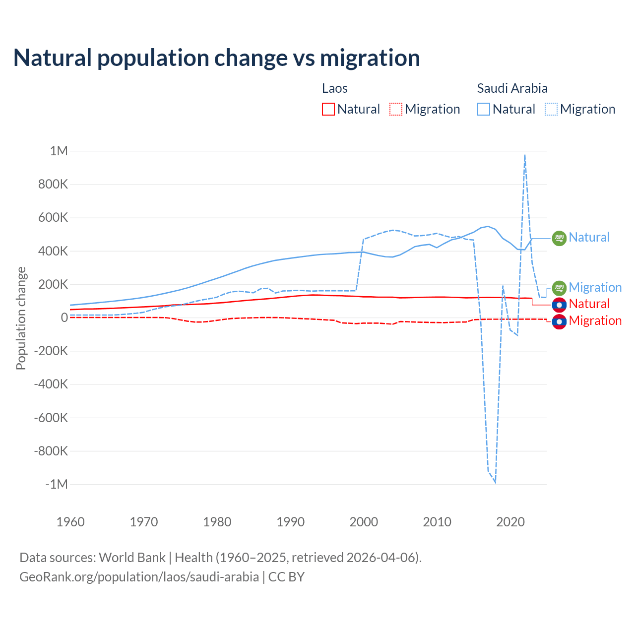 Over the last 10 years, 90.6% of the population change in Laos is from natural causes (a gain of 1,183,013 people) and 9.41% is from migration (a loss of 122,899 people). In Saudi Arabia 93.9% is from natural causes (a gain of 4,829,562 people) and 6.05% is from migration (a gain of 311,209 people).