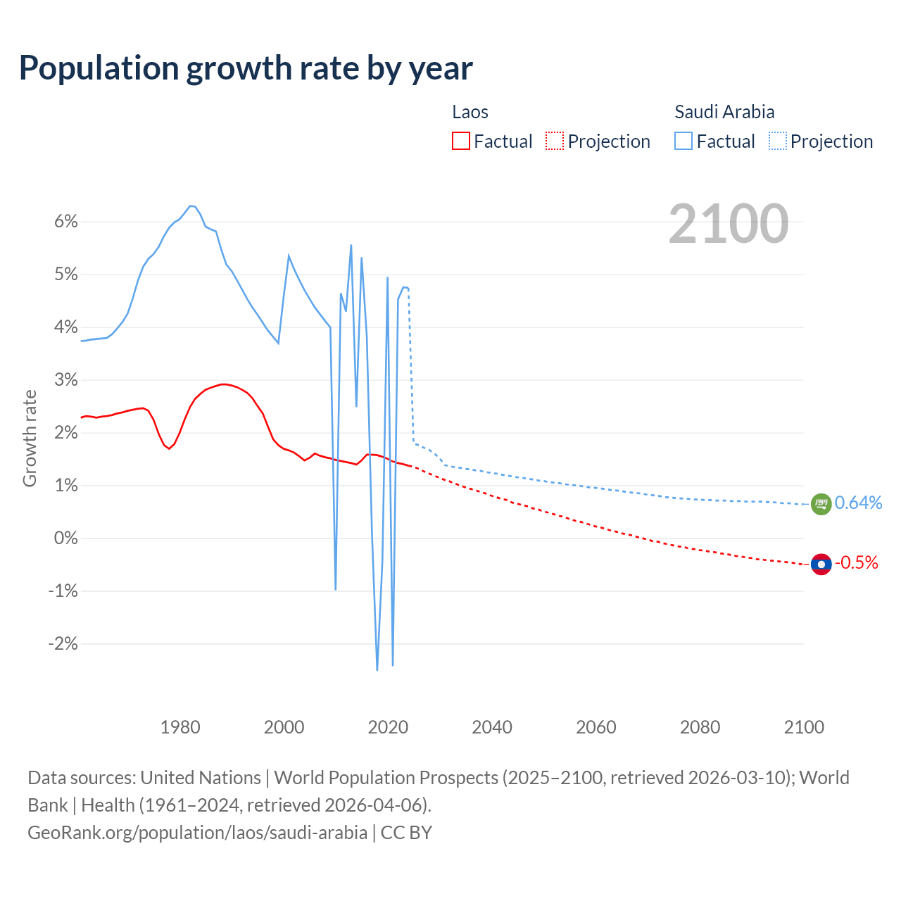 - For the last 10 years, Laos has had an average growth rate of +1.48% per year vs +2.3% in Saudi Arabia.