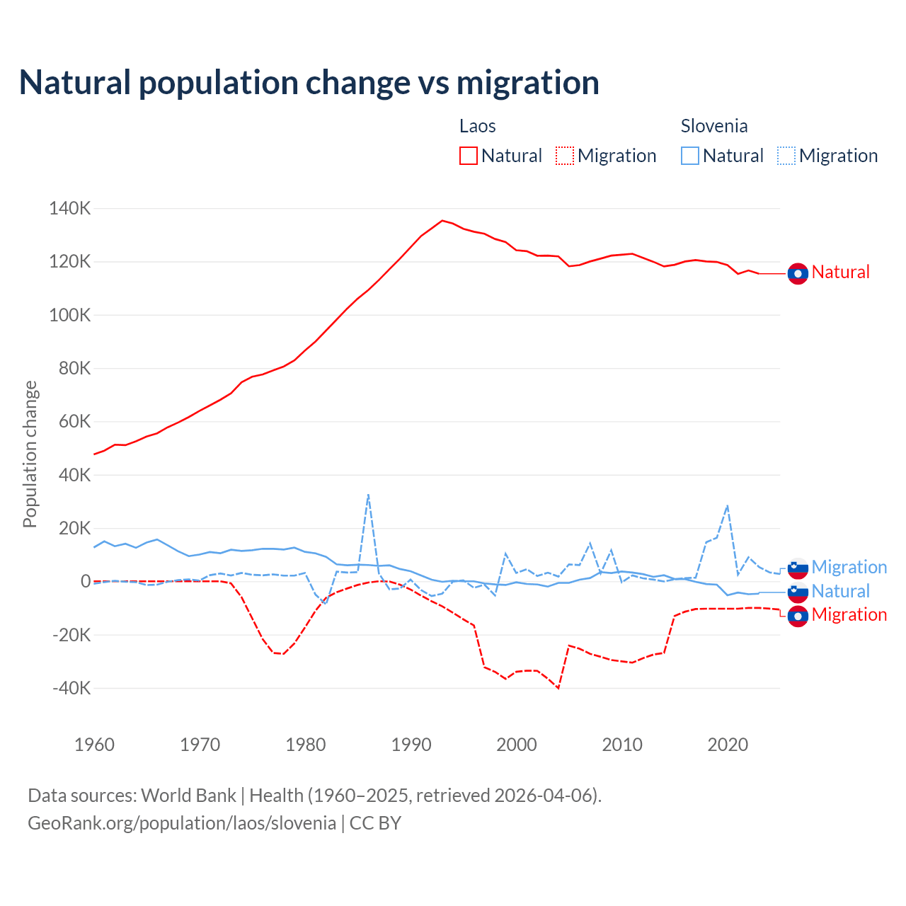 Over the last 10 years, 90.6% of the population change in Laos is from natural causes (a gain of 1,183,013 people) and 9.41% is from migration (a loss of 122,899 people). In Slovenia 18.1% is from natural causes (a loss of 17,573 people) and 81.9% is from migration (a gain of 79,532 people).