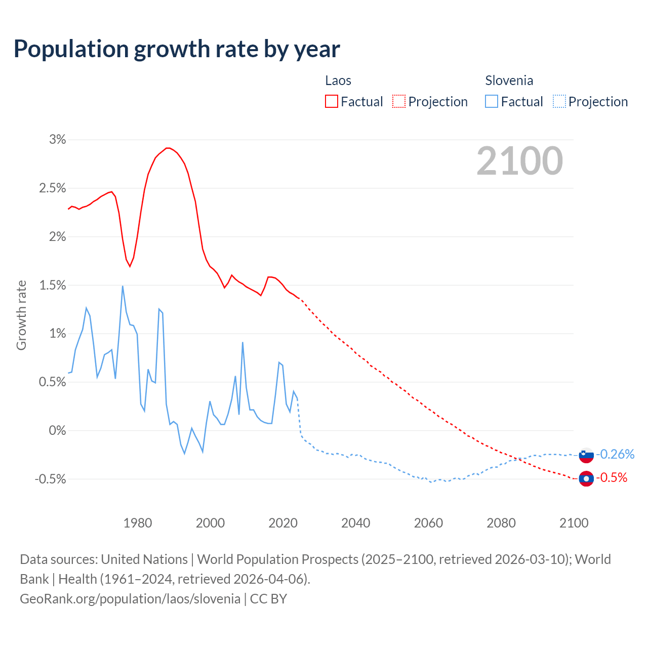 - For the last 10 years, Laos has had an average growth rate of +1.48% per year vs +0.29% in Slovenia.