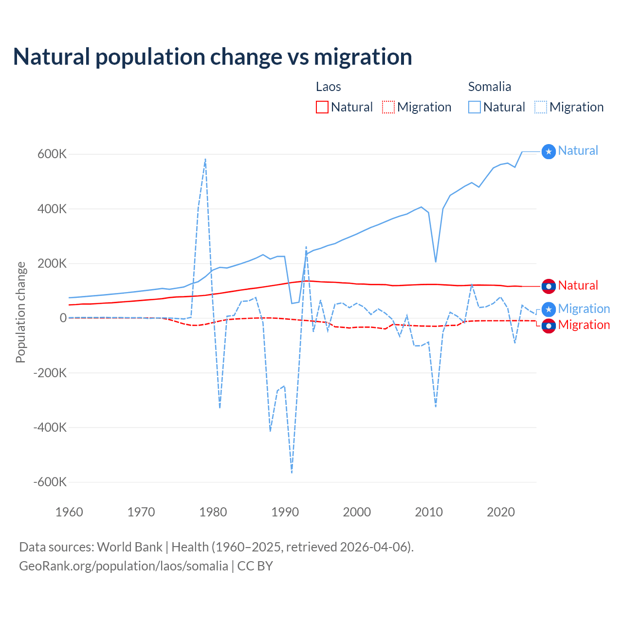 Over the last 10 years, 90.6% of the population change in Laos is from natural causes (a gain of 1,183,013 people) and 9.41% is from migration (a loss of 122,899 people). In Somalia 94.4% is from natural causes (a gain of 5,270,105 people) and 5.58% is from migration (a gain of 311,487 people).