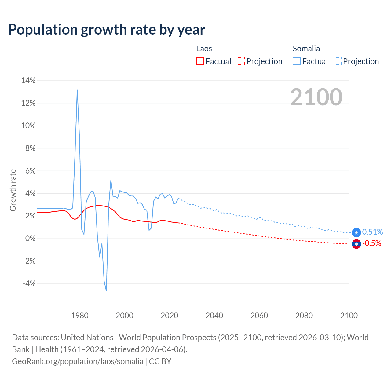 - For the last 10 years, Laos has had an average growth rate of +1.48% per year vs +3.61% in Somalia.