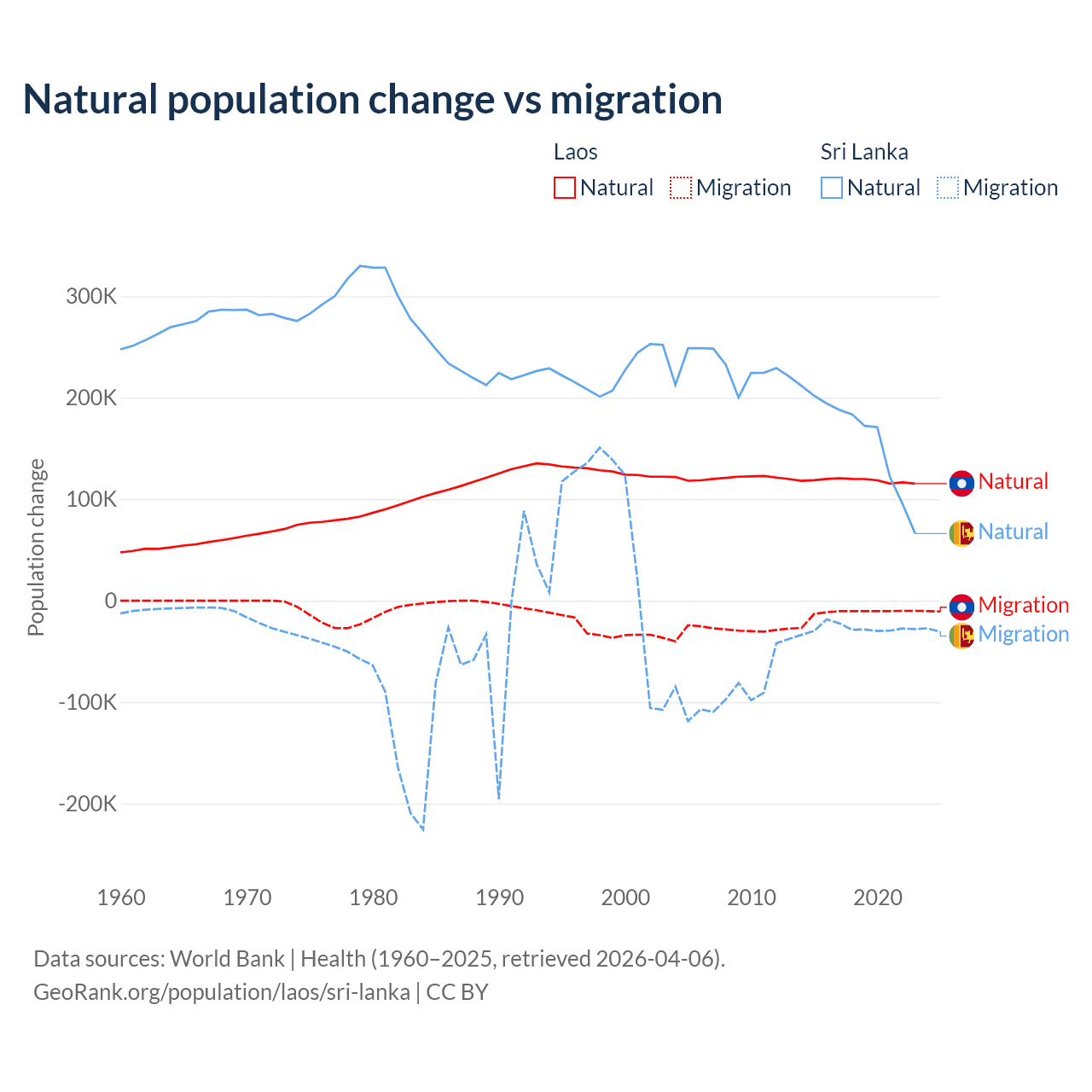 Over the last 10 years, 90.6% of the population change in Laos is from natural causes (a gain of 1,183,013 people) and 9.41% is from migration (a loss of 122,899 people). In Sri Lanka 85.3% is from natural causes (a gain of 1,605,749 people) and 14.7% is from migration (a loss of 276,121 people).