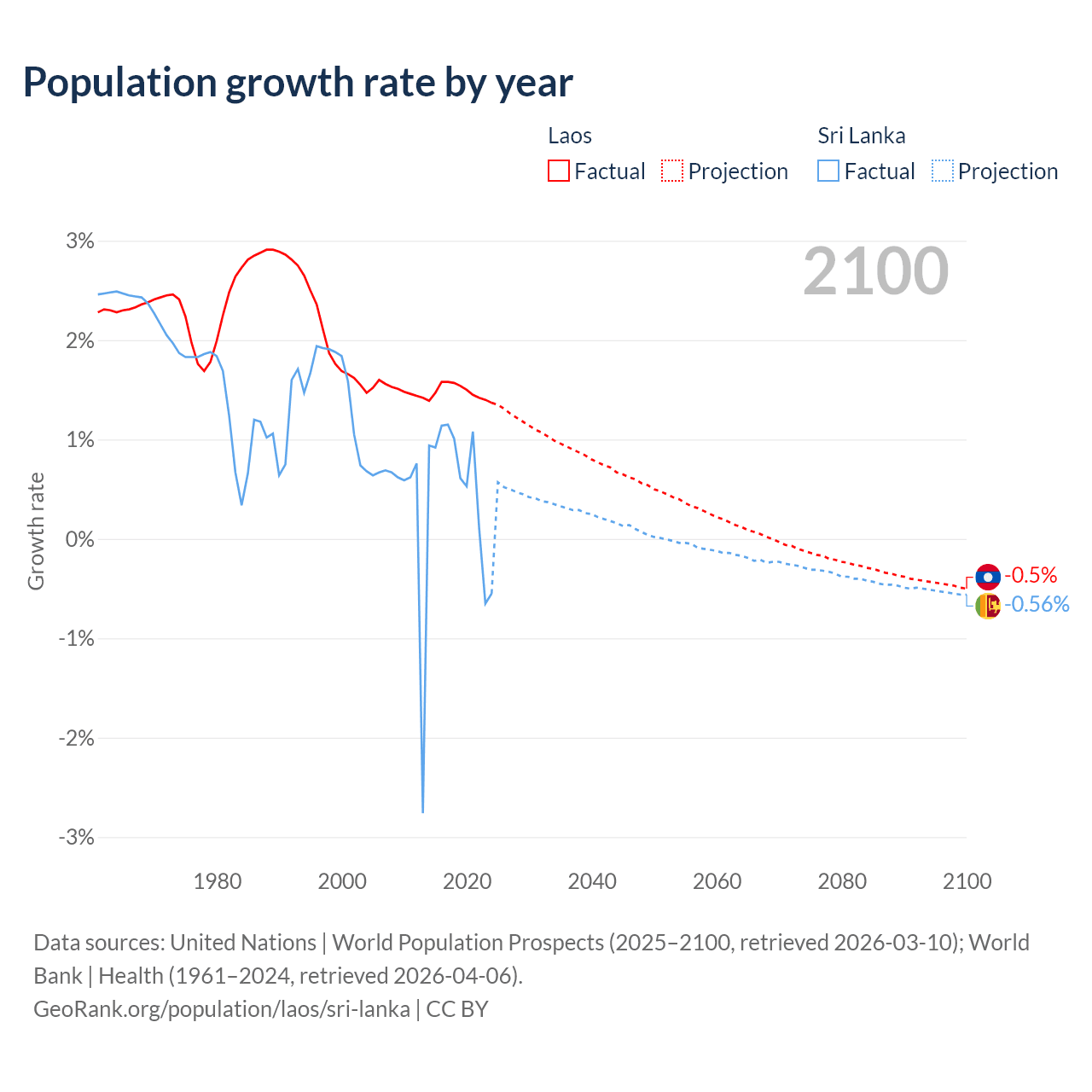 - For the last 10 years, Laos has had an average growth rate of +1.48% per year vs +0.57% in Sri Lanka.