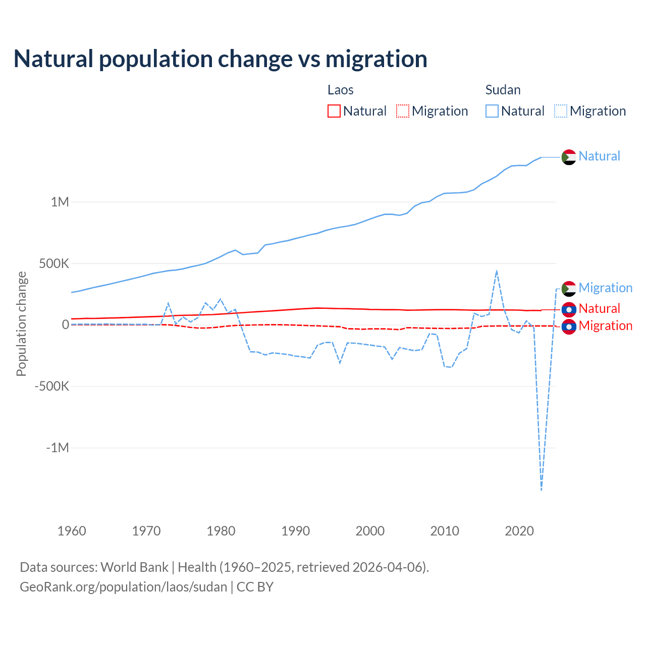 Over the last 10 years, 90.6% of the population change in Laos is from natural causes (a gain of 1,183,013 people) and 9.41% is from migration (a loss of 122,899 people). In Sudan 95.1% is from natural causes (a gain of 12,459,977 people) and 4.88% is from migration (a loss of 639,596 people).