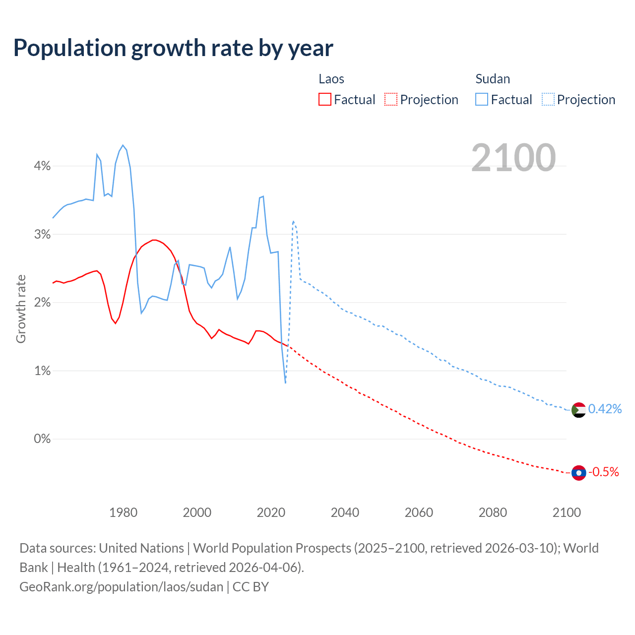 - For the last 10 years, Laos has had an average growth rate of +1.48% per year vs +2.67% in Sudan.