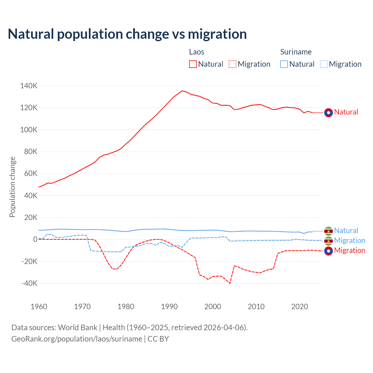 Over the last 10 years, 90.6% of the population change in Laos is from natural causes (a gain of 1,183,013 people) and 9.41% is from migration (a loss of 122,899 people). In Suriname 90.3% is from natural causes (a gain of 66,709 people) and 9.72% is from migration (a loss of 7,185 people).