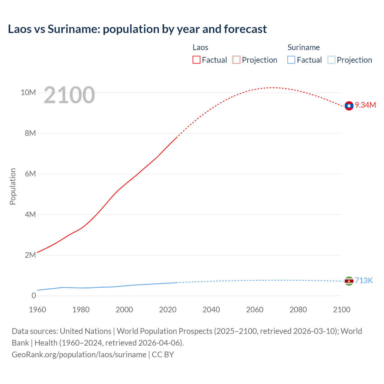 Laos vs Suriname: population by year and forecast
