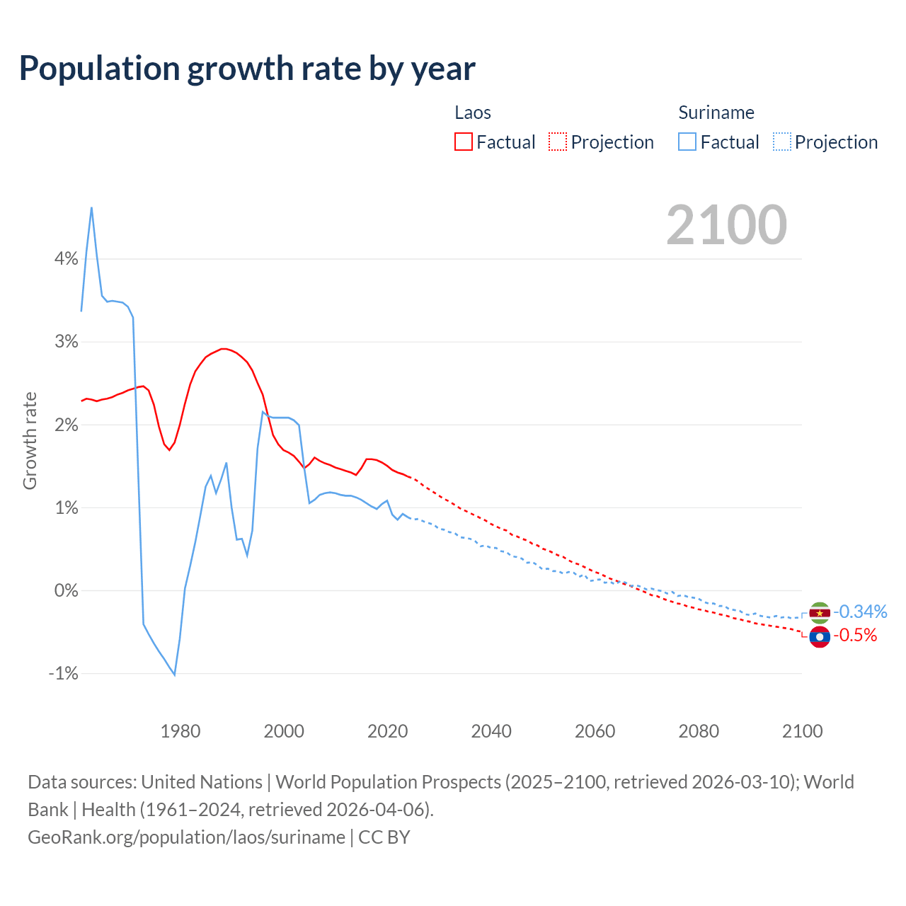 - For the last 10 years, Laos has had an average growth rate of +1.48% per year vs +0.99% in Suriname.