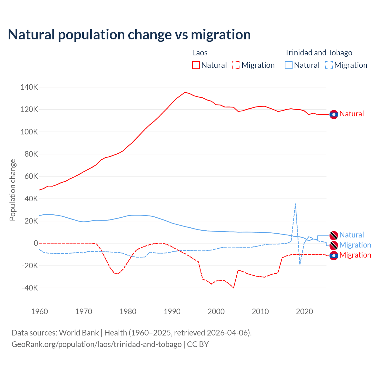 Over the last 10 years, 90.6% of the population change in Laos is from natural causes (a gain of 1,183,013 people) and 9.41% is from migration (a loss of 122,899 people). In Trinidad and Tobago 66% is from natural causes (a gain of 55,887 people) and 34% is from migration (a gain of 28,785 people).