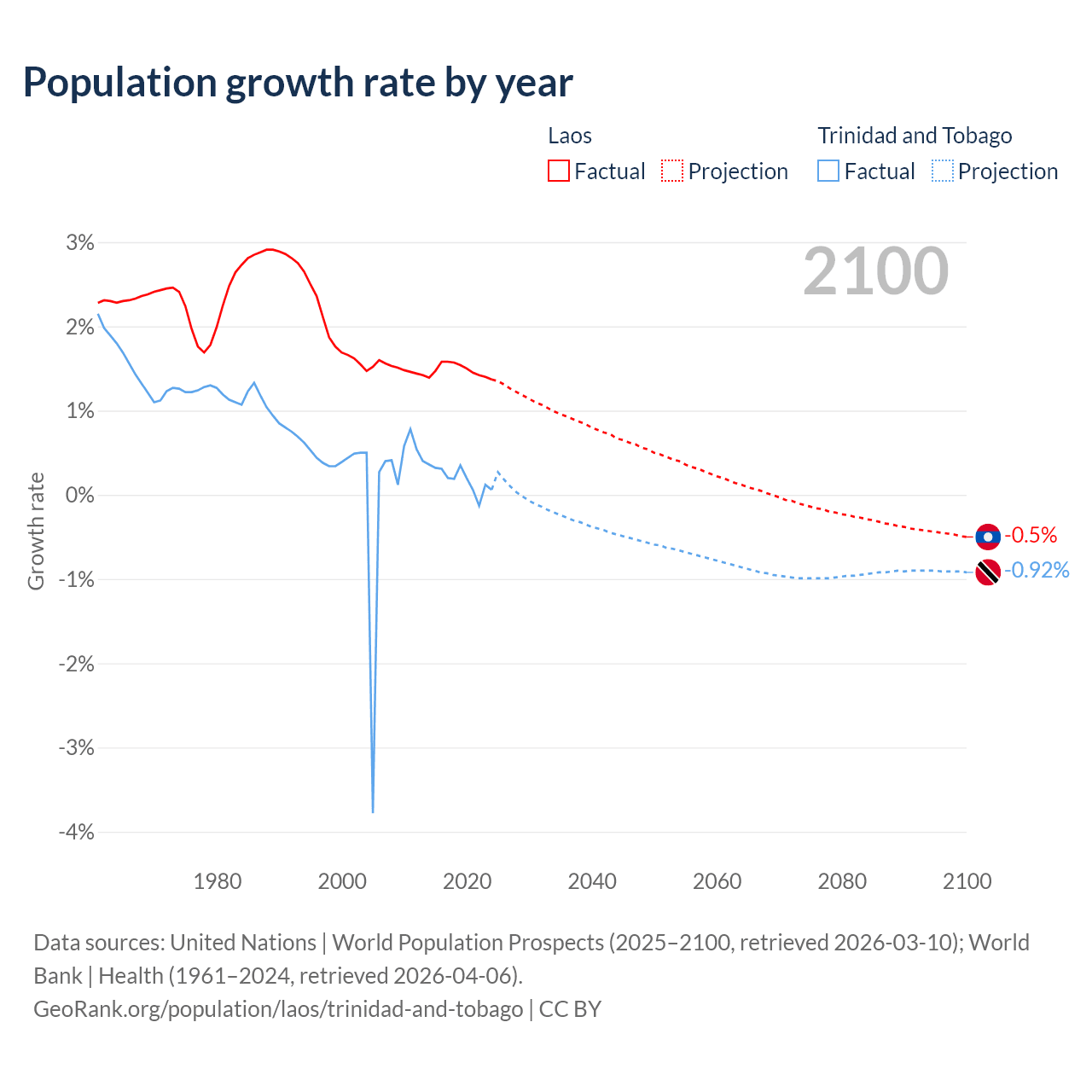 - For the last 10 years, Laos has had an average growth rate of +1.48% per year vs +0.19% in Trinidad and Tobago.