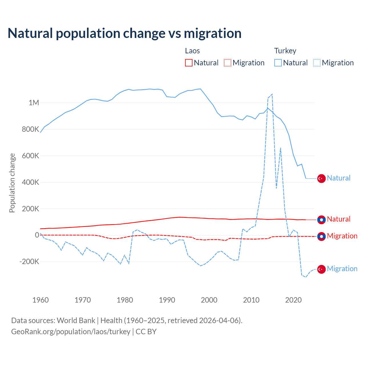 Over the last 10 years, 90.6% of the population change in Laos is from natural causes (a gain of 1,183,013 people) and 9.41% is from migration (a loss of 122,899 people). In Turkey 73% is from natural causes (a gain of 7,333,352 people) and 27% is from migration (a gain of 2,718,916 people).