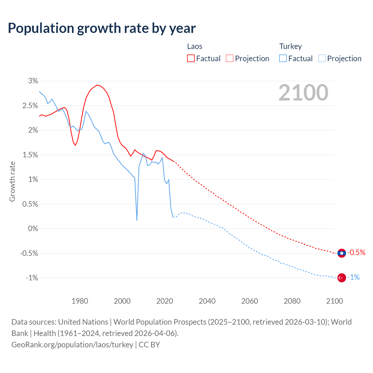 - For the last 10 years, Laos has had an average growth rate of +1.48% per year vs +1.06% in Turkey.