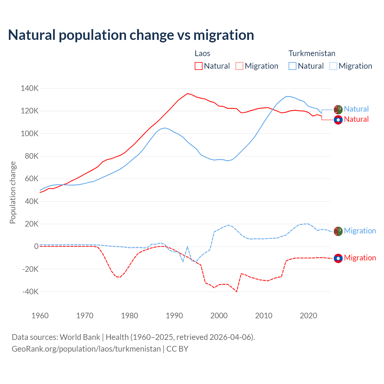 Over the last 10 years, 90.6% of the population change in Laos is from natural causes (a gain of 1,183,013 people) and 9.41% is from migration (a loss of 122,899 people). In Turkmenistan 89.2% is from natural causes (a gain of 1,270,228 people) and 10.8% is from migration (a gain of 154,379 people).