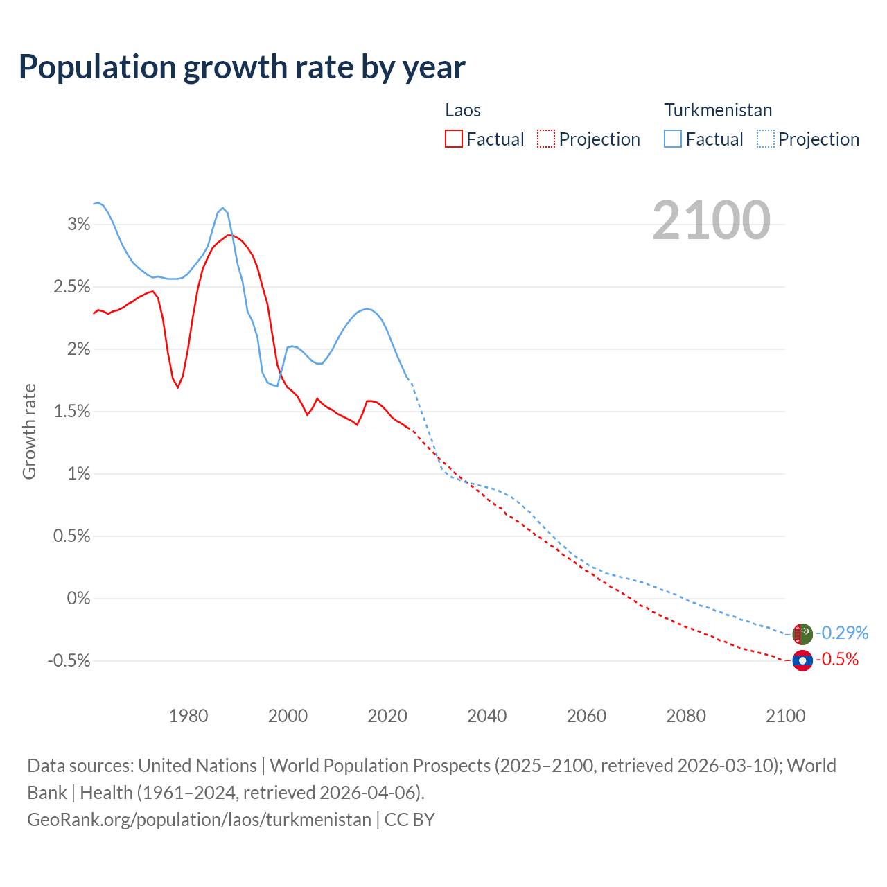 - For the last 10 years, Laos has had an average growth rate of +1.48% per year vs +2.14% in Turkmenistan.