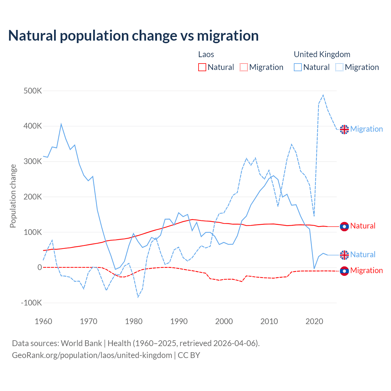 Over the last 10 years, 90.6% of the population change in Laos is from natural causes (a gain of 1,183,013 people) and 9.41% is from migration (a loss of 122,899 people). In the United Kingdom 23.9% is from natural causes (a gain of 1,033,129 people) and 76.1% is from migration (a gain of 3,283,101 people).