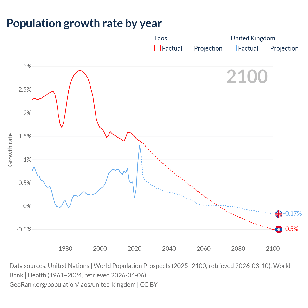 - For the last 10 years, Laos has had an average growth rate of +1.48% per year vs +0.7% in the United Kingdom.