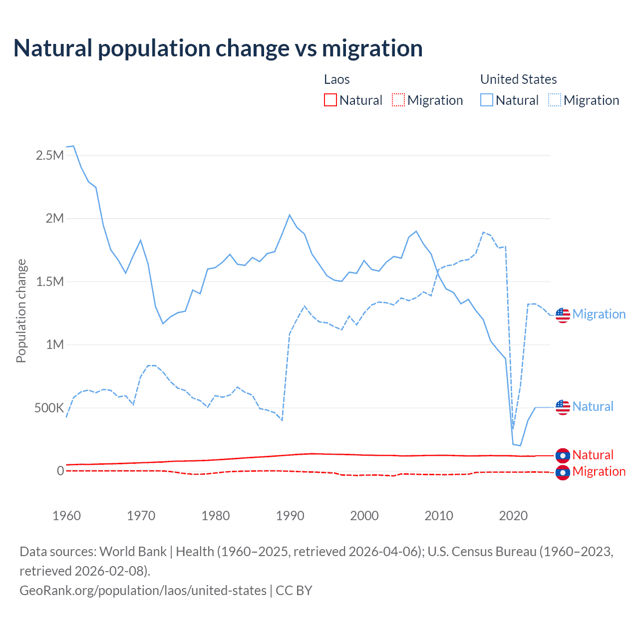 Over the last 10 years, 90.6% of the population change in Laos is from natural causes (a gain of 1,183,013 people) and 9.41% is from migration (a loss of 122,899 people). In the United States 35.8% is from natural causes (a gain of 8,005,866 people) and 64.2% is from migration (a gain of 14,334,286 people).