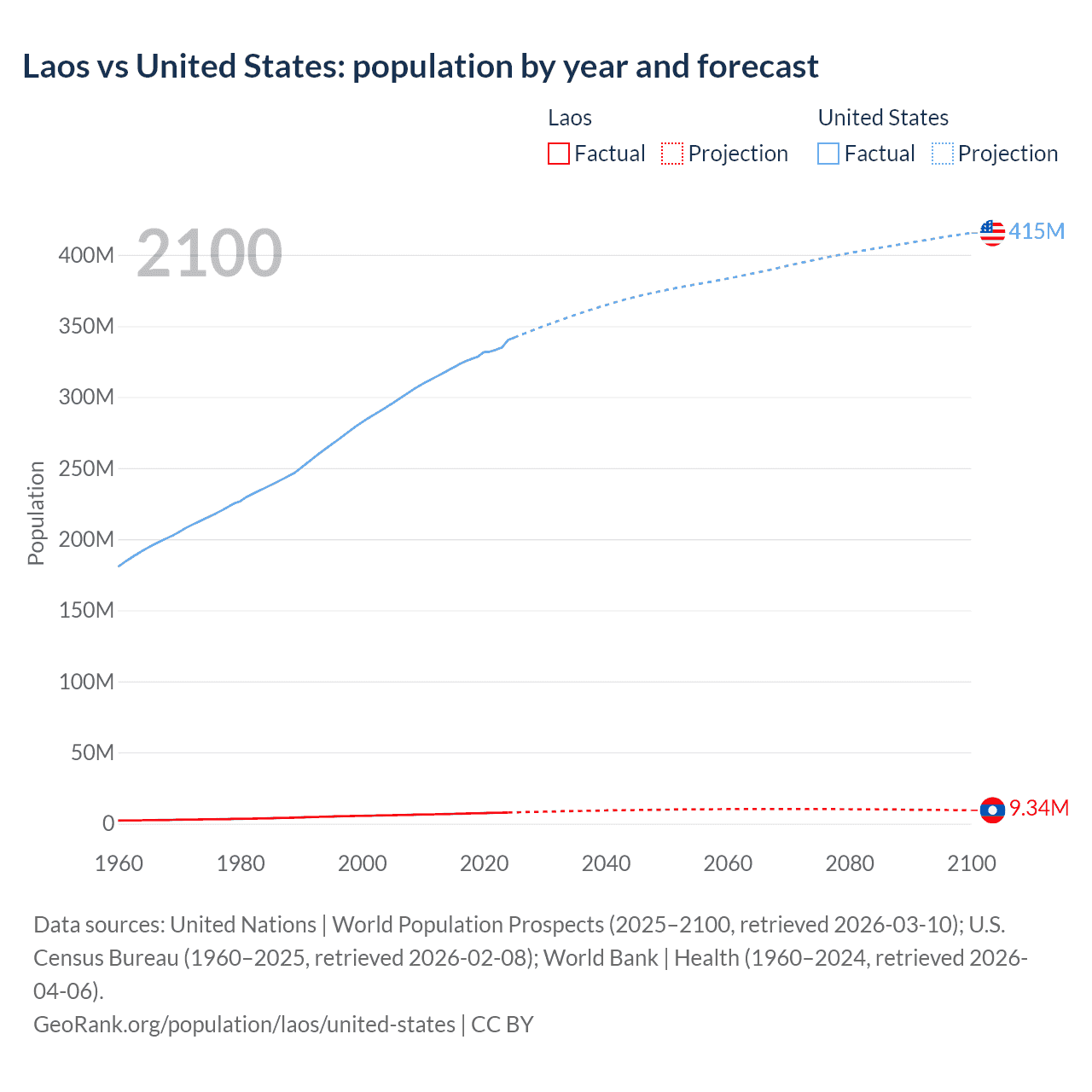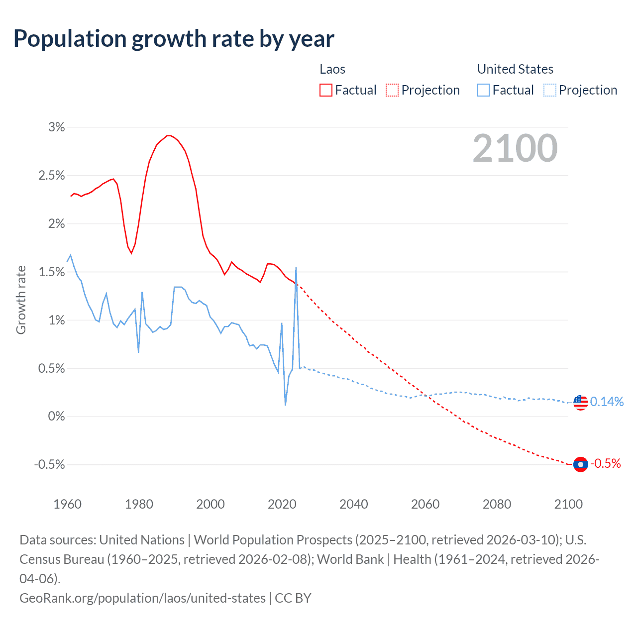 Data sources: World Bank | Health (1960–2024, retrieved 2026-04-06); United Nations | World Population Prospects (1960–2026, retrieved 2026-03-10); U.S. Census Bureau (1960–2025, retrieved 2026-02-08); Central Intelligence Agency (CIA) (2000–2019, retrieved 2026-02-20).