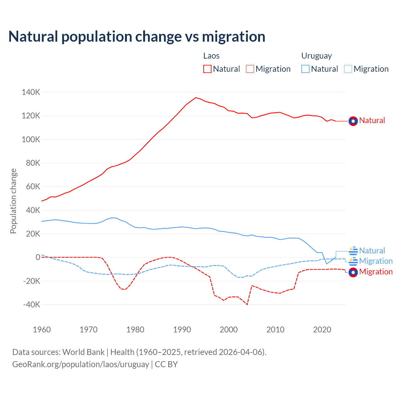 Over the last 10 years, 90.6% of the population change in Laos is from natural causes (a gain of 1,183,013 people) and 9.41% is from migration (a loss of 122,899 people). In Uruguay 70% is from natural causes (a gain of 64,303 people) and 30% is from migration (a loss of 27,501 people).