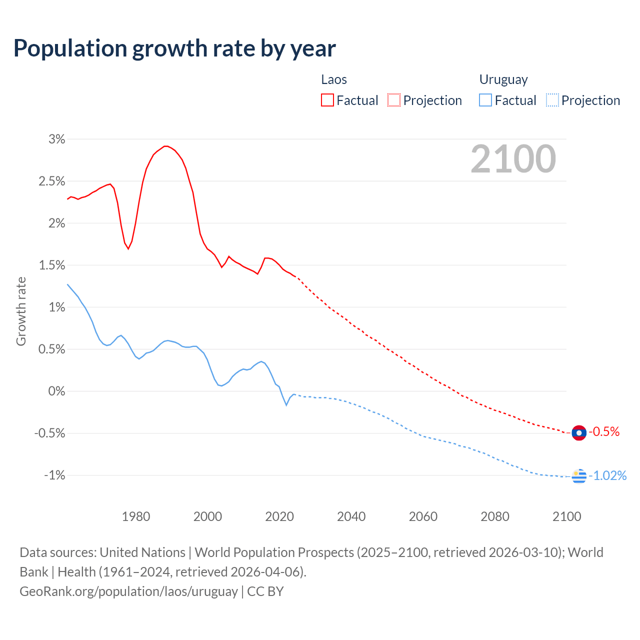 - For the last 10 years, Laos has had an average growth rate of +1.48% per year vs +0.11% in Uruguay.