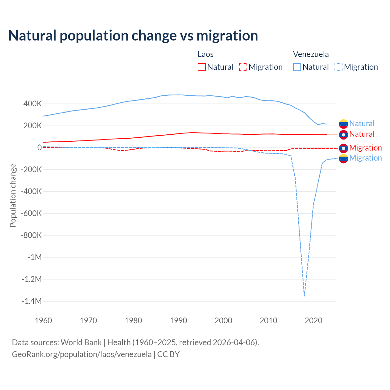 Over the last 10 years, 90.6% of the population change in Laos is from natural causes (a gain of 1,183,013 people) and 9.41% is from migration (a loss of 122,899 people). In Venezuela 38.6% is from natural causes (a gain of 2,946,257 people) and 61.4% is from migration (a loss of 4,683,227 people).