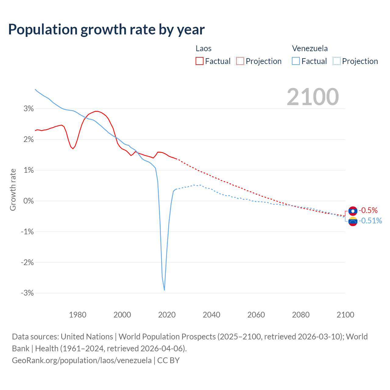 - For the last 10 years, Laos has had an average growth rate of +1.48% per year vs -0.46% in Venezuela.