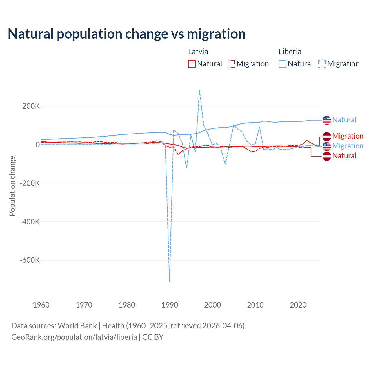 Over the last 10 years, 82.7% of the population change in Latvia is from natural causes (a loss of 103,711 people) and 17.3% is from migration (a loss of 21,641 people). In Liberia 87.7% is from natural causes (a gain of 1,202,387 people) and 12.3% is from migration (a loss of 168,316 people).