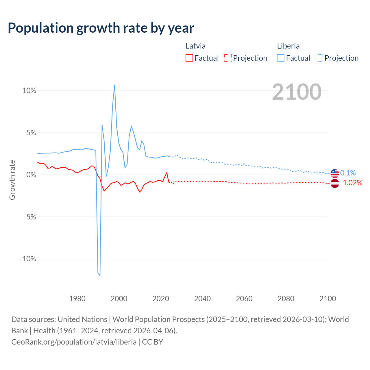 - For the last 10 years, Latvia has had an average growth rate of -0.68% per year vs +2.09% in Liberia.