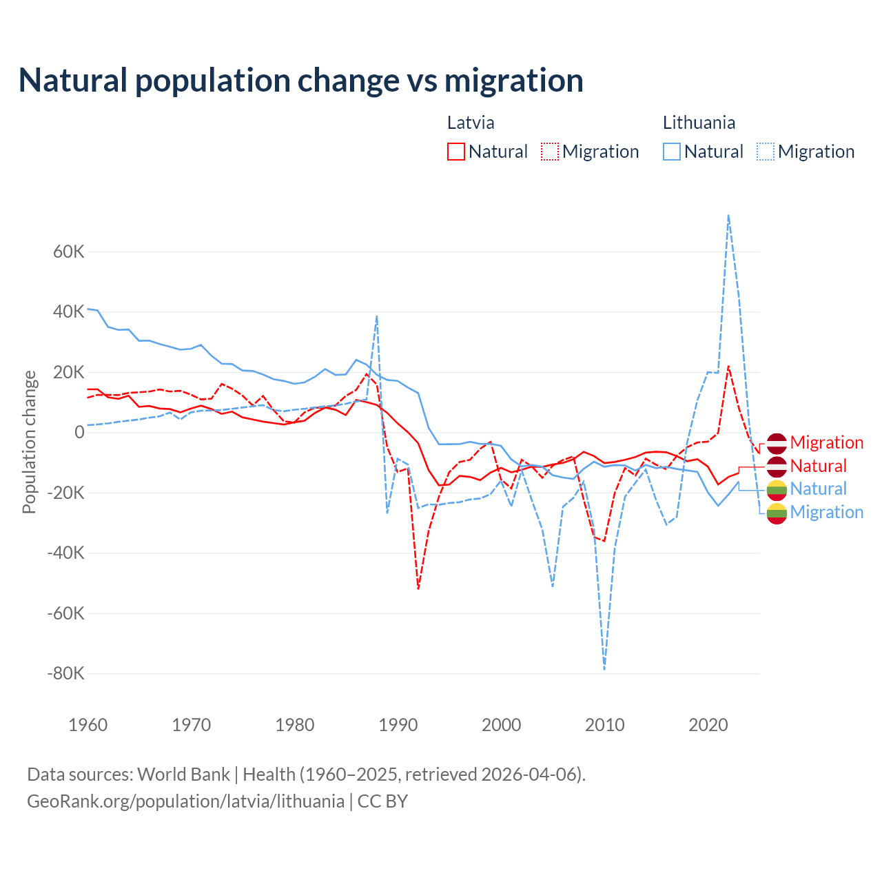 Over the last 10 years, 82.7% of the population change in Latvia is from natural causes (a loss of 103,711 people) and 17.3% is from migration (a loss of 21,641 people). In Lithuania 68.7% is from natural causes (a loss of 153,859 people) and 31.3% is from migration (a gain of 70,196 people).