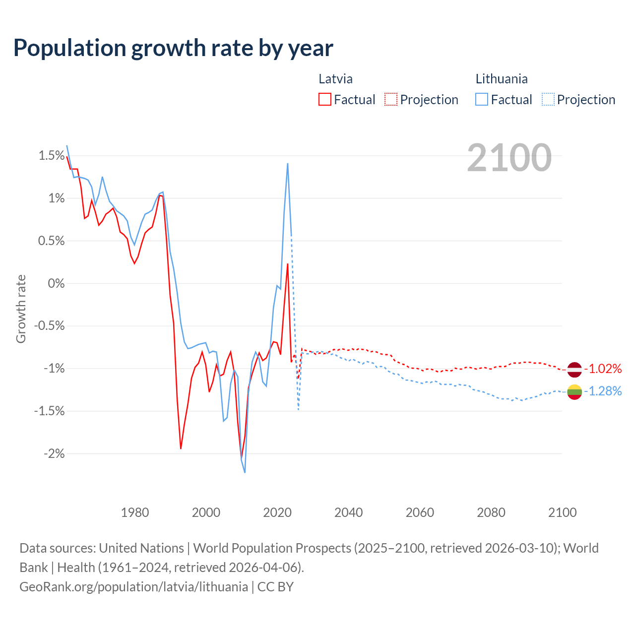 - For the last 10 years, Latvia has had an average growth rate of -0.68% per year vs -0.22% in Lithuania.