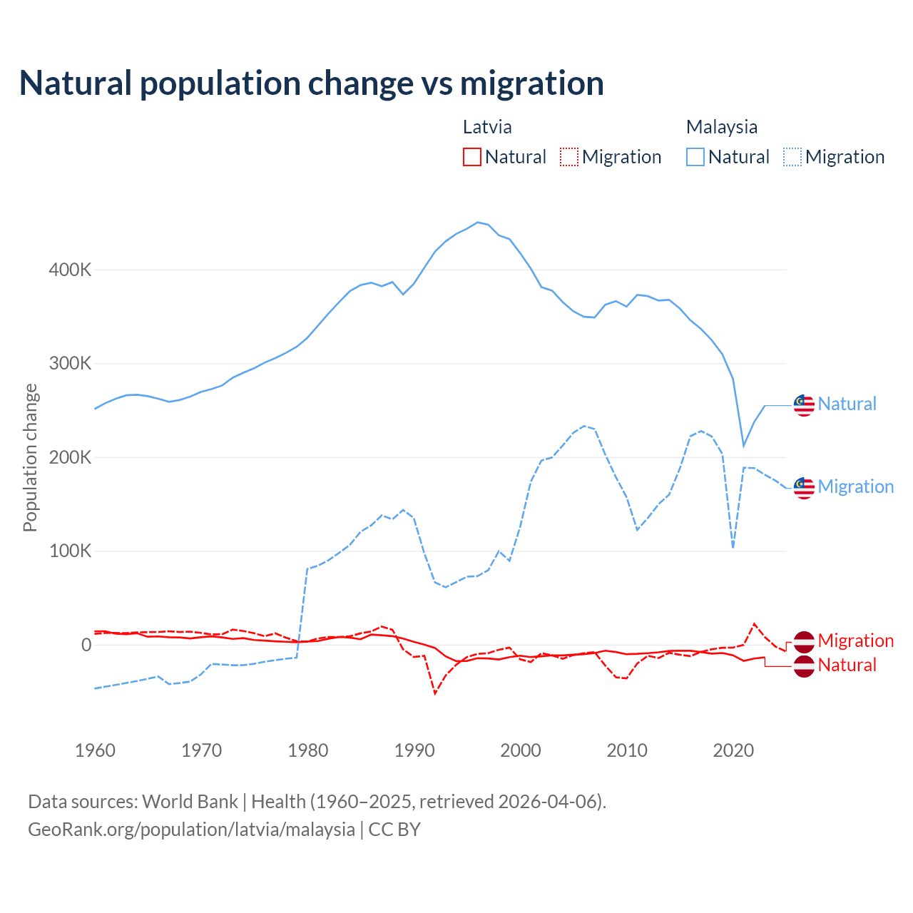 Over the last 10 years, 82.7% of the population change in Latvia is from natural causes (a loss of 103,711 people) and 17.3% is from migration (a loss of 21,641 people). In Malaysia 61.7% is from natural causes (a gain of 3,029,648 people) and 38.3% is from migration (a gain of 1,882,159 people).