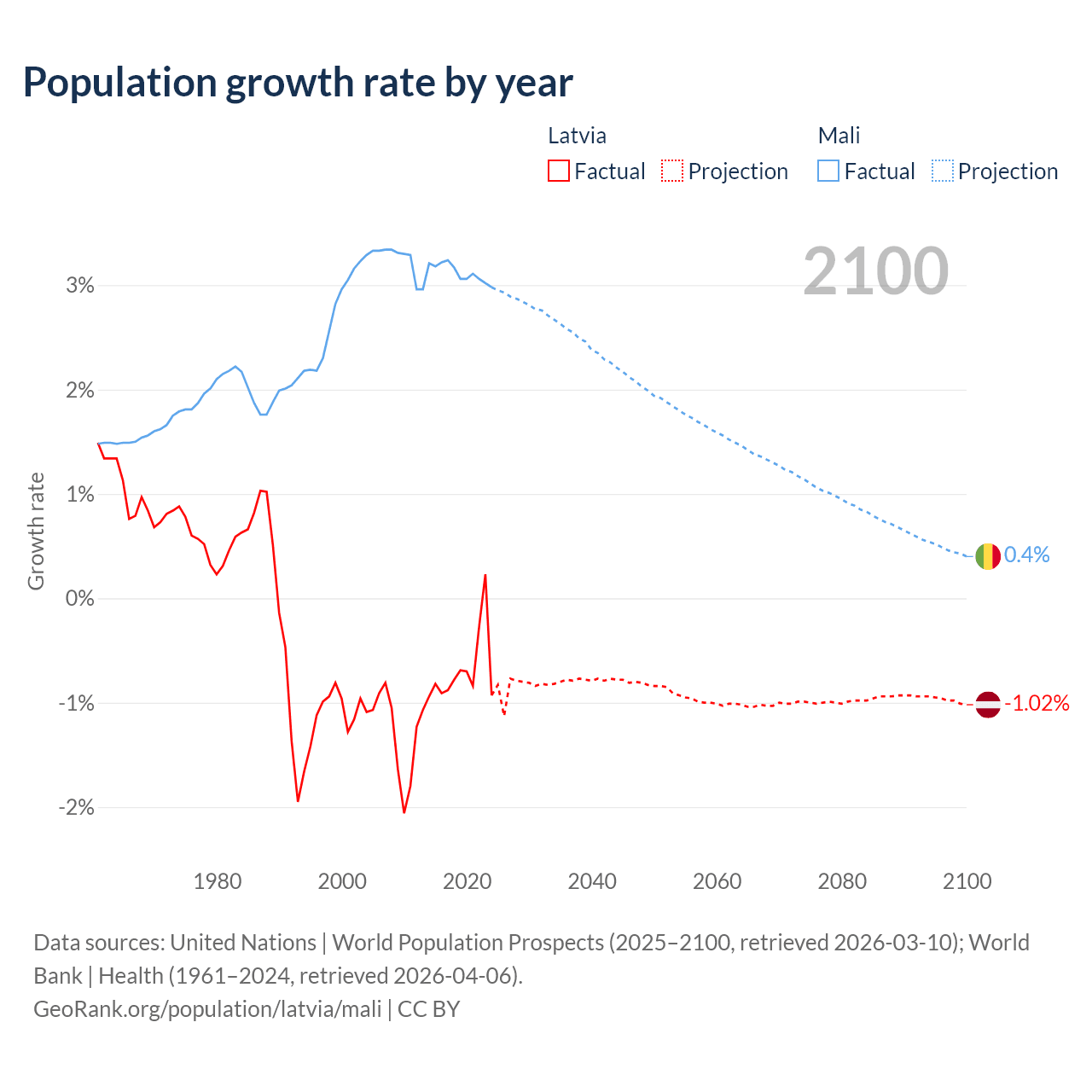 - For the last 10 years, Latvia has had an average growth rate of -0.68% per year vs +3.12% in Mali.