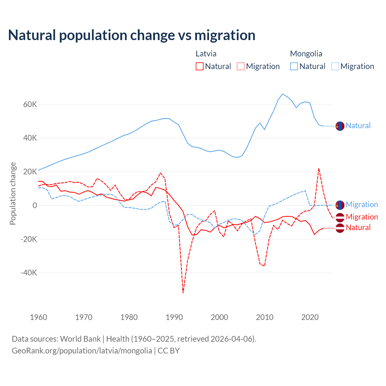 Over the last 10 years, 82.7% of the population change in Latvia is from natural causes (a loss of 103,711 people) and 17.3% is from migration (a loss of 21,641 people). In Mongolia 94.1% is from natural causes (a gain of 580,367 people) and 5.87% is from migration (a gain of 36,163 people).
