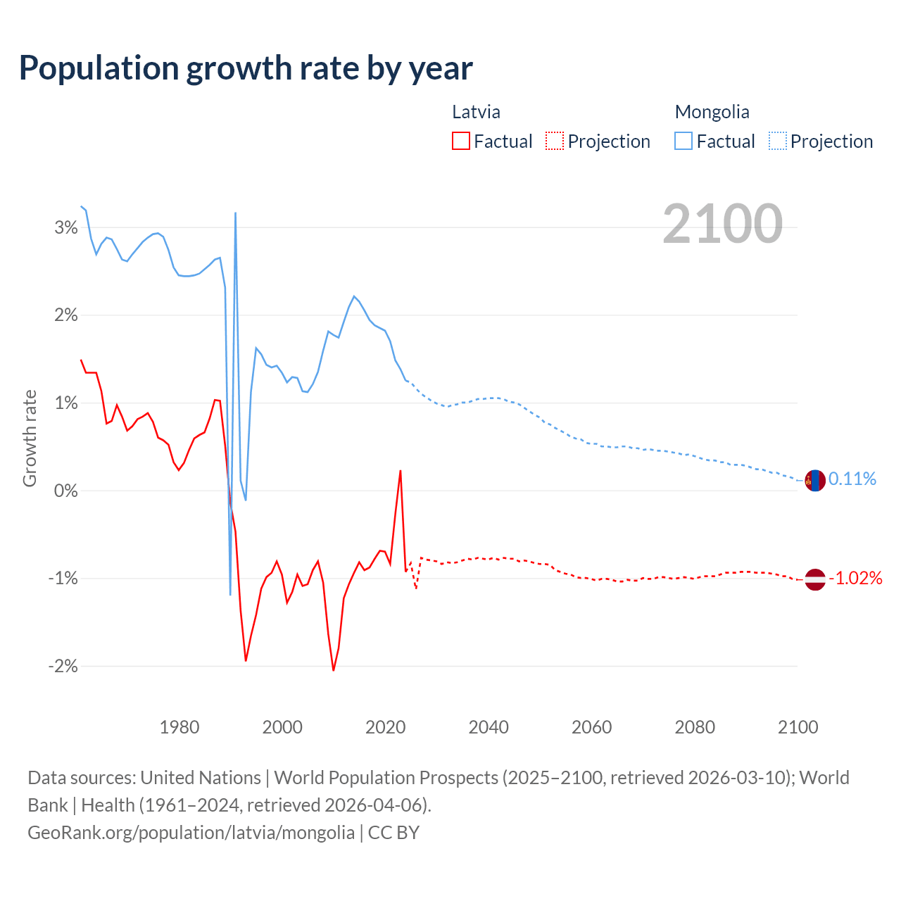 - For the last 10 years, Latvia has had an average growth rate of -0.68% per year vs +1.79% in Mongolia.