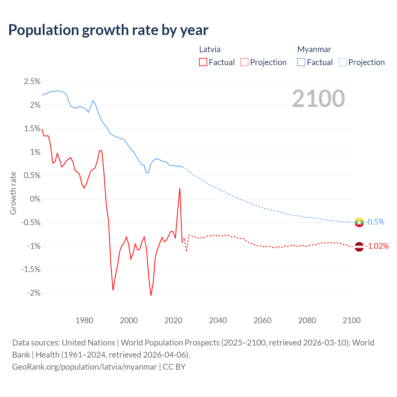 - For the last 10 years, Latvia has had an average growth rate of -0.68% per year vs +0.74% in Myanmar.