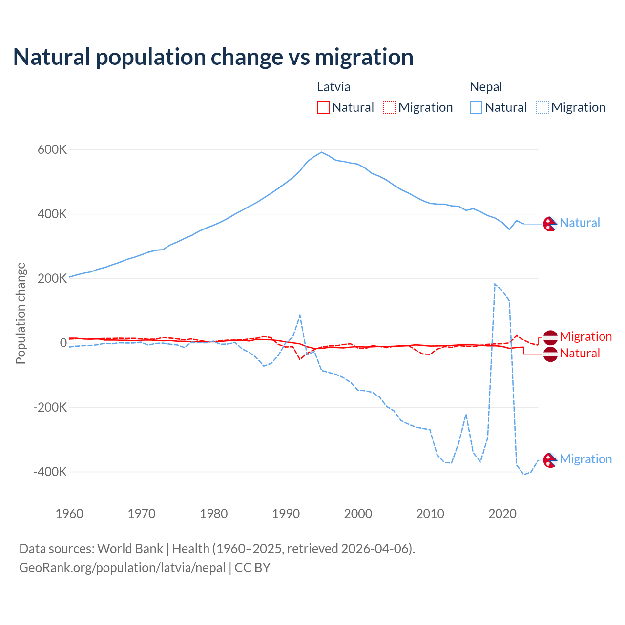 Over the last 10 years, 82.7% of the population change in Latvia is from natural causes (a loss of 103,711 people) and 17.3% is from migration (a loss of 21,641 people). In Nepal 67.9% is from natural causes (a gain of 3,909,749 people) and 32.1% is from migration (a loss of 1,851,664 people).