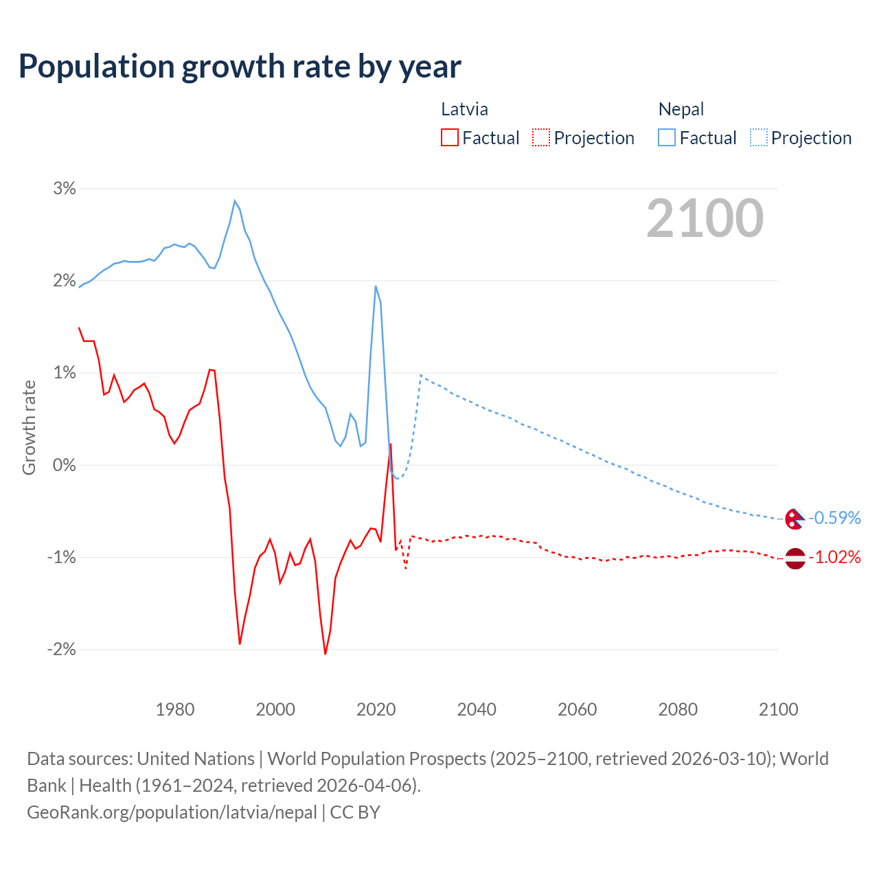 - For the last 10 years, Latvia has had an average growth rate of -0.68% per year vs +0.66% in Nepal.