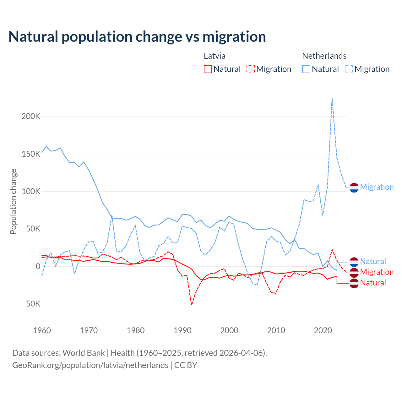 Over the last 10 years, 82.7% of the population change in Latvia is from natural causes (a loss of 103,711 people) and 17.3% is from migration (a loss of 21,641 people). In the Netherlands 11.8% is from natural causes (a gain of 134,554 people) and 88.2% is from migration (a gain of 1,006,495 people).