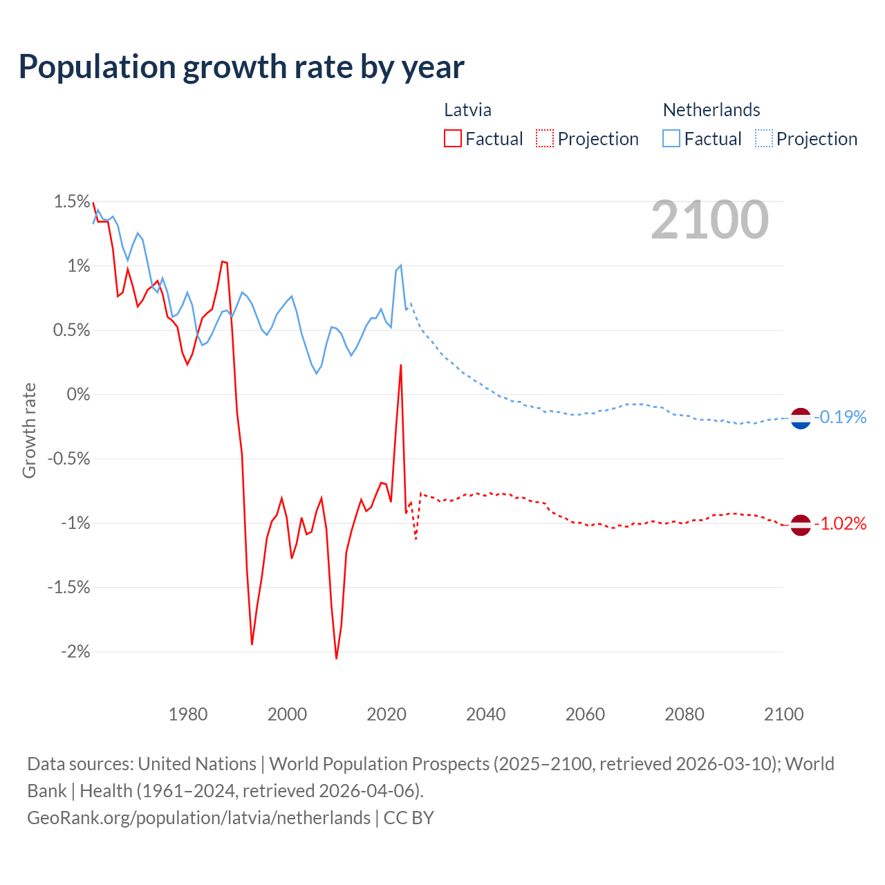 - For the last 10 years, Latvia has had an average growth rate of -0.68% per year vs +0.62% in the Netherlands.