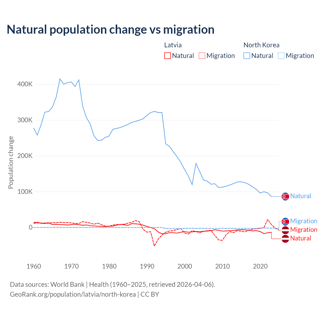Over the last 10 years, 82.7% of the population change in Latvia is from natural causes (a loss of 103,711 people) and 17.3% is from migration (a loss of 21,641 people). In North Korea 97.7% is from natural causes (a gain of 1,097,372 people) and 2.33% is from migration (a loss of 26,227 people).
