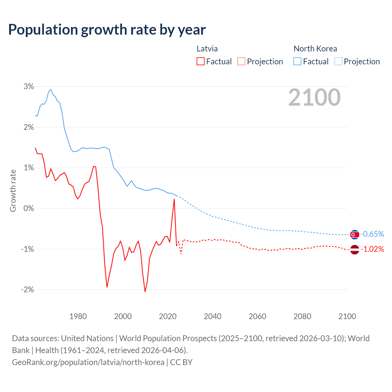 - For the last 10 years, Latvia has had an average growth rate of -0.68% per year vs +0.41% in North Korea.