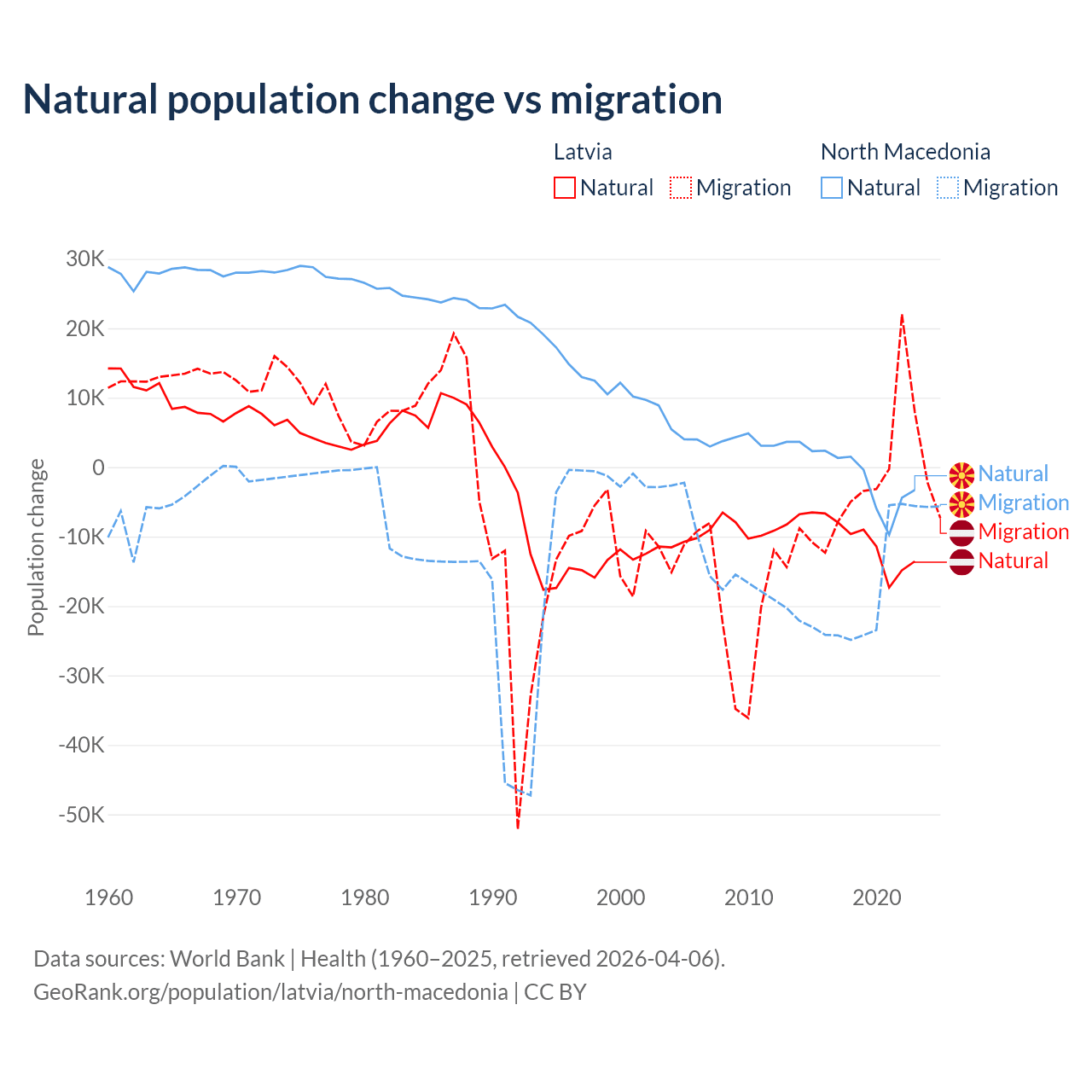 Over the last 10 years, 82.7% of the population change in Latvia is from natural causes (a loss of 103,711 people) and 17.3% is from migration (a loss of 21,641 people). In North Macedonia 6.45% is from natural causes (a loss of 12,585 people) and 93.5% is from migration (a loss of 182,429 people).