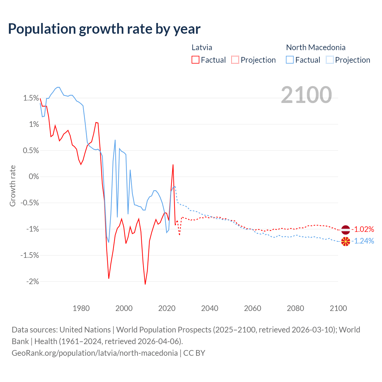 - For the last 10 years, Latvia has had an average growth rate of -0.68% per year vs -0.48% in North Macedonia.